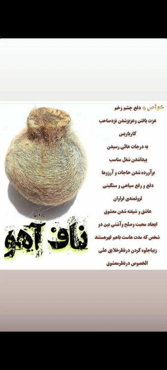 خواص ناف آهو مشک اصل : عزت یافتن و عزیز شدن نزد صاحب کار یا رئیس (ارتقا شغلی) _ به درجات عالی رسیدن _ پیدا شدن شغل مناسب _ بر آورده شدن حاجات و آرزو ها _ دفع و رفع سیاهی و سنگینی _ ثروتمندی فراوان _ عاشق و شیفته شدن معشوق و ...